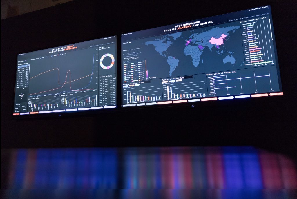 如果我能监测各国的价值观,是否能更好地了解他们的战略和行动?《VoV交易平台》实时告诉观展者交易如何比他们的股票旗帜形态技术图更好地描述社会。它现在是《价值中的价值》艺术网站的仪表板。
