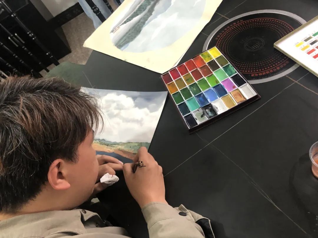 光昇:怀着忐忑和憧憬的心情深入贵州山水之间,第一眼便被惊艳,奇山秀水,山形独特似粽子状,极富有形式美感,云贵高原使人感觉天空就压在头顶,云朵变化莫测,光感强烈,作画其中,怡然自得。我们身居城市的钢筋铁骨之中,偶有机会跟着学校老师们出来感受自然山水之趣,自然心旷神怡,对心理和艺术思维也是一种开阔。导师给我们进行现场写生示范,让我们更了解了对景造意的方式方法,体察到自然之美。一周的写生结束,但写生创作的激情还未熄灭,之后还会继续对它进行创作。意犹未尽!南大贵州右二此行永生难忘!