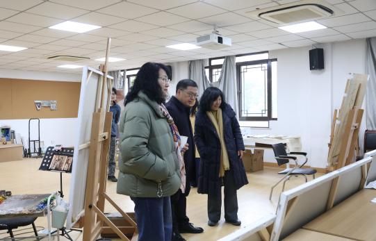 座谈会开始之前,学院领导走访了浦口校区艺术楼油画、中国画、书法、雕塑等专业教室,认真察看教室布置、设备配备及安全管理情况,关注问询同学们的创作作品与创作进展,对走访中发现的问题当即提出了解决措施,并安排落实。学院领导们充分肯定了专业教室网格员的工作,希望大家继续努力,共同把校园安全工作做实、做细,为同学们创造舒适安全的学习创作环境。