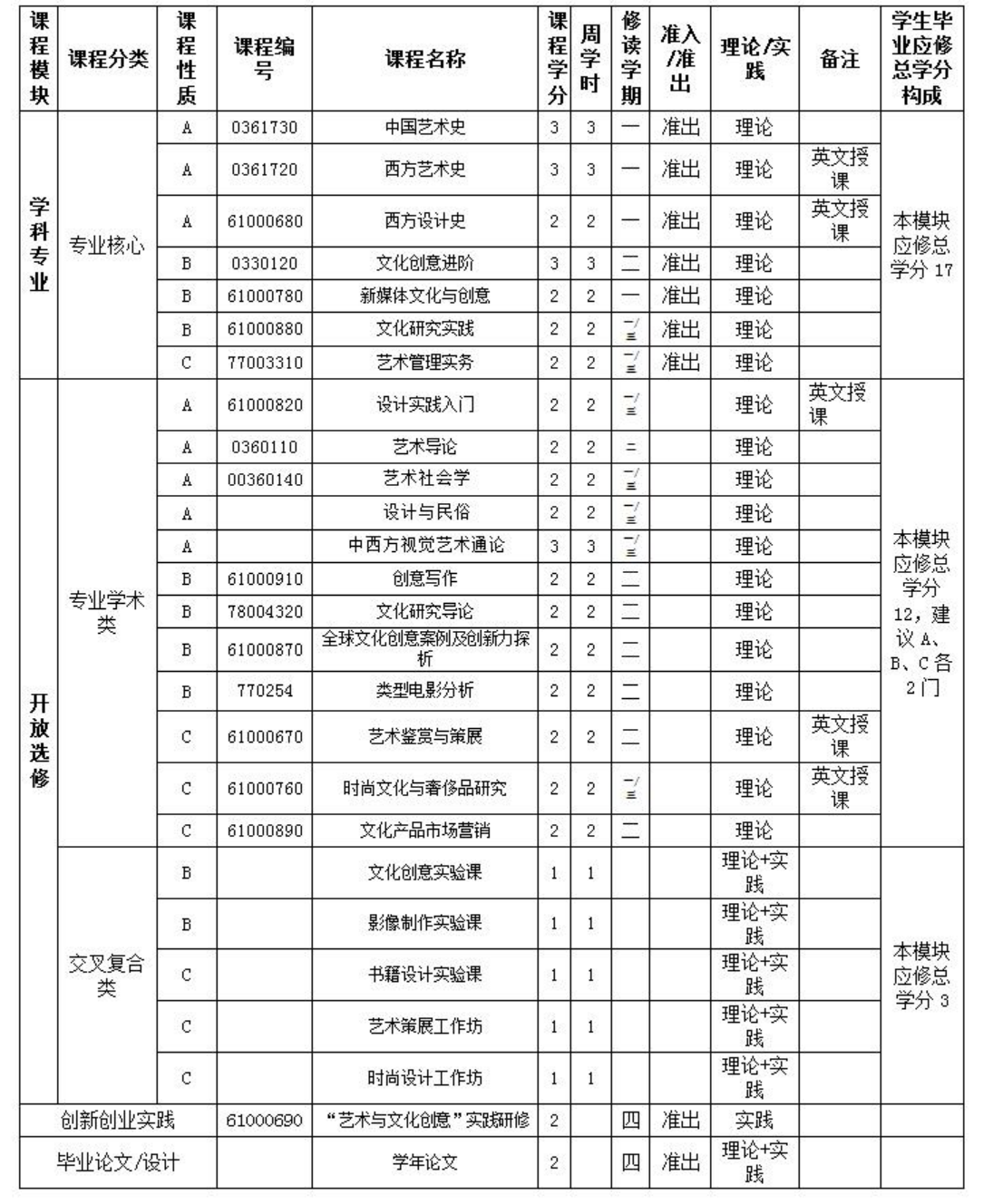 “艺术与文化创意”第二专业依据学院学科优势,通过文化艺术的理论教育提升学生的人文素养和艺术专业基础,采取“课堂授课+专业实践+国际交流”的创新性人才培养模式:通过创意实践和文化产业的相关课程培养学生创新创业的思维模式和基本技能,通过社会实践加强学生在文化创意领域的实际应用能力与实战应对能力。本专业努力构建个性化、多元化的培养体系,旨在培养在拥有较强艺术鉴赏力和创造性的同时,兼具调研能力、策划能力、执行能力与管理能力的应用型、创新型、复合型人才。