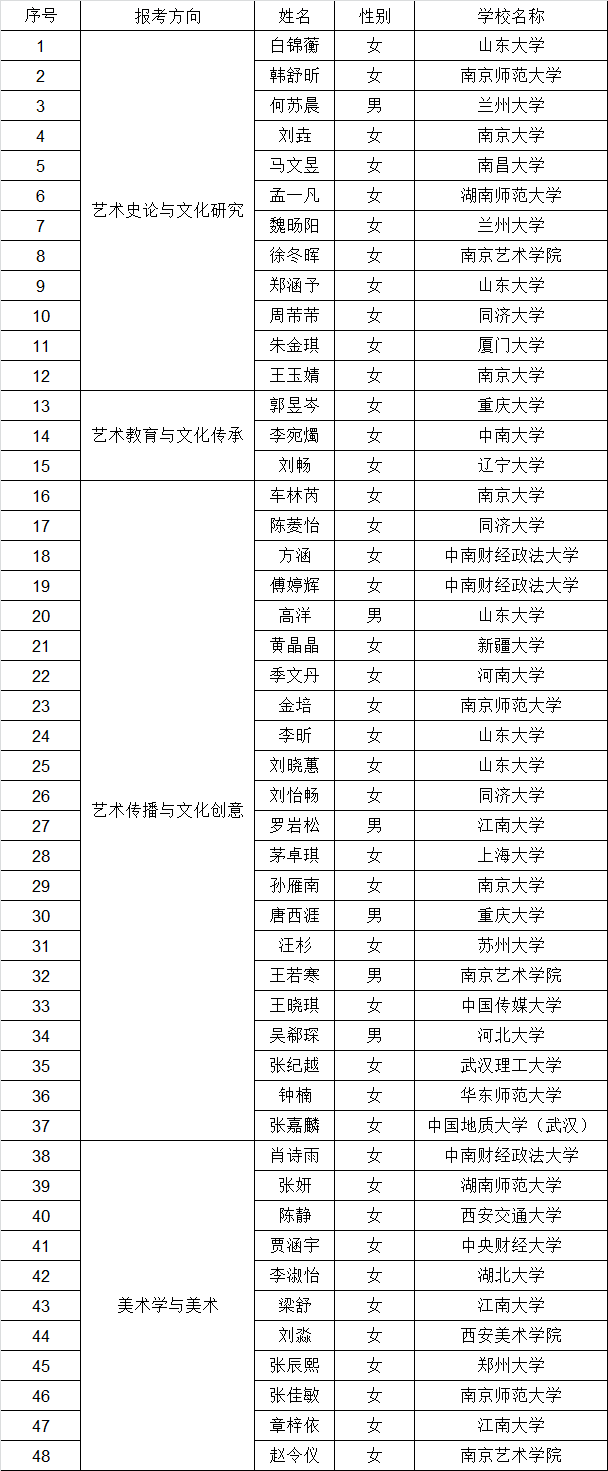 本着公开公平公正的原则,结合申请者院校、在校期间学术科研、综合素质等情况,经学院评审委员会讨论评选,选拔以下同学为国产偷拍 2019 年“艺术与文化”暑期夏令营学员。现将名单公布如下:
