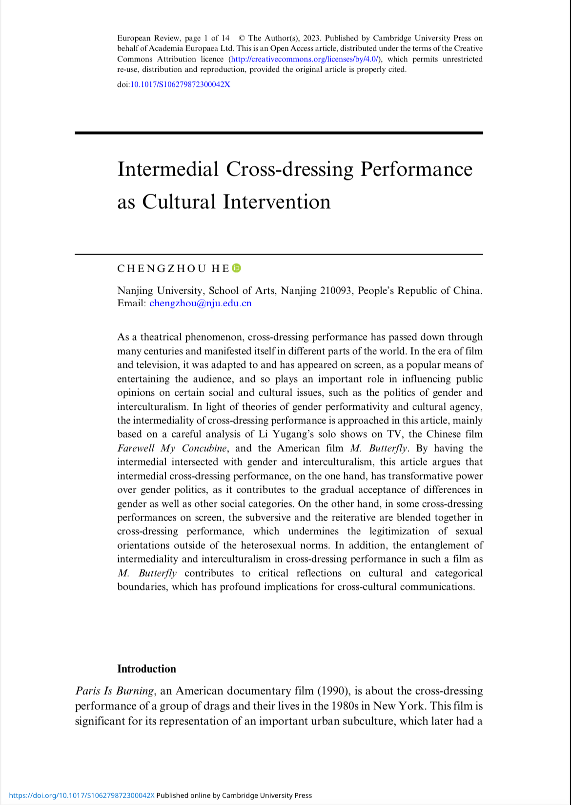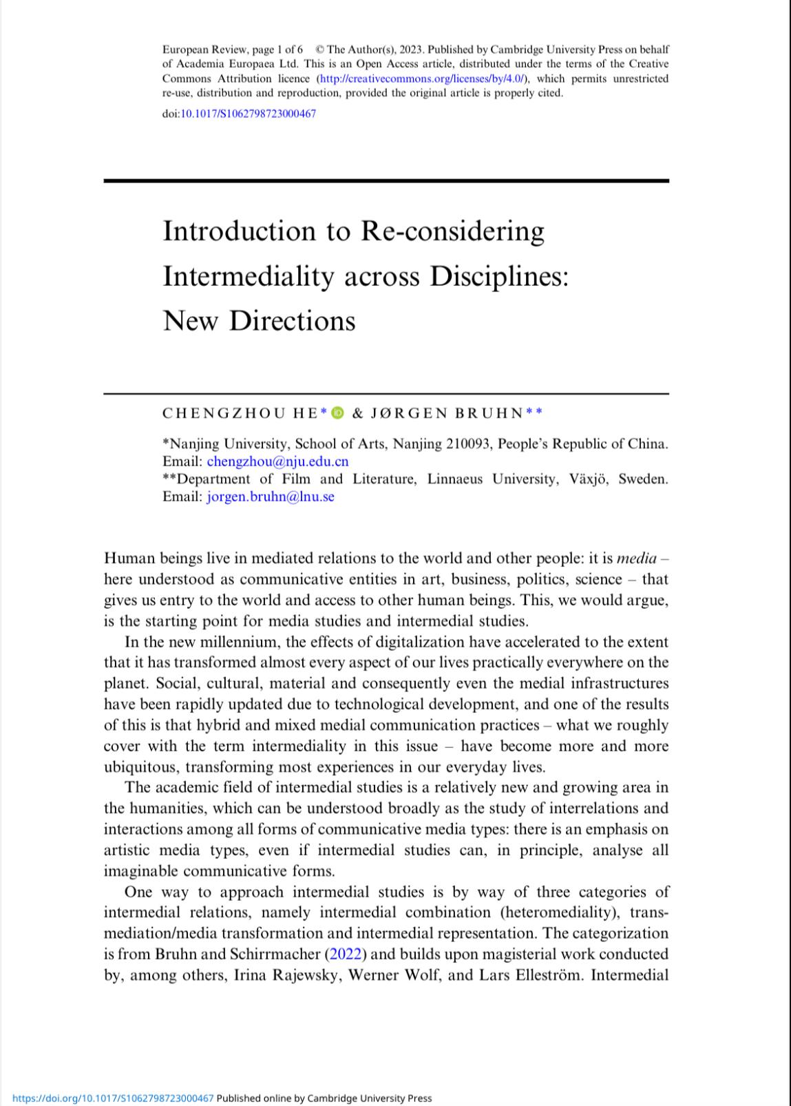 EUROPEAN REVIEW(《欧洲评论》,SSCI收录期刊)是欧洲科学院院刊,202310月推出跨媒介研究专辑,由我校何成洲教授和瑞典学者Jorgen Bruhn教授主编,发表10篇论文,作者来自中国、英国、丹麦、瑞典等国家。