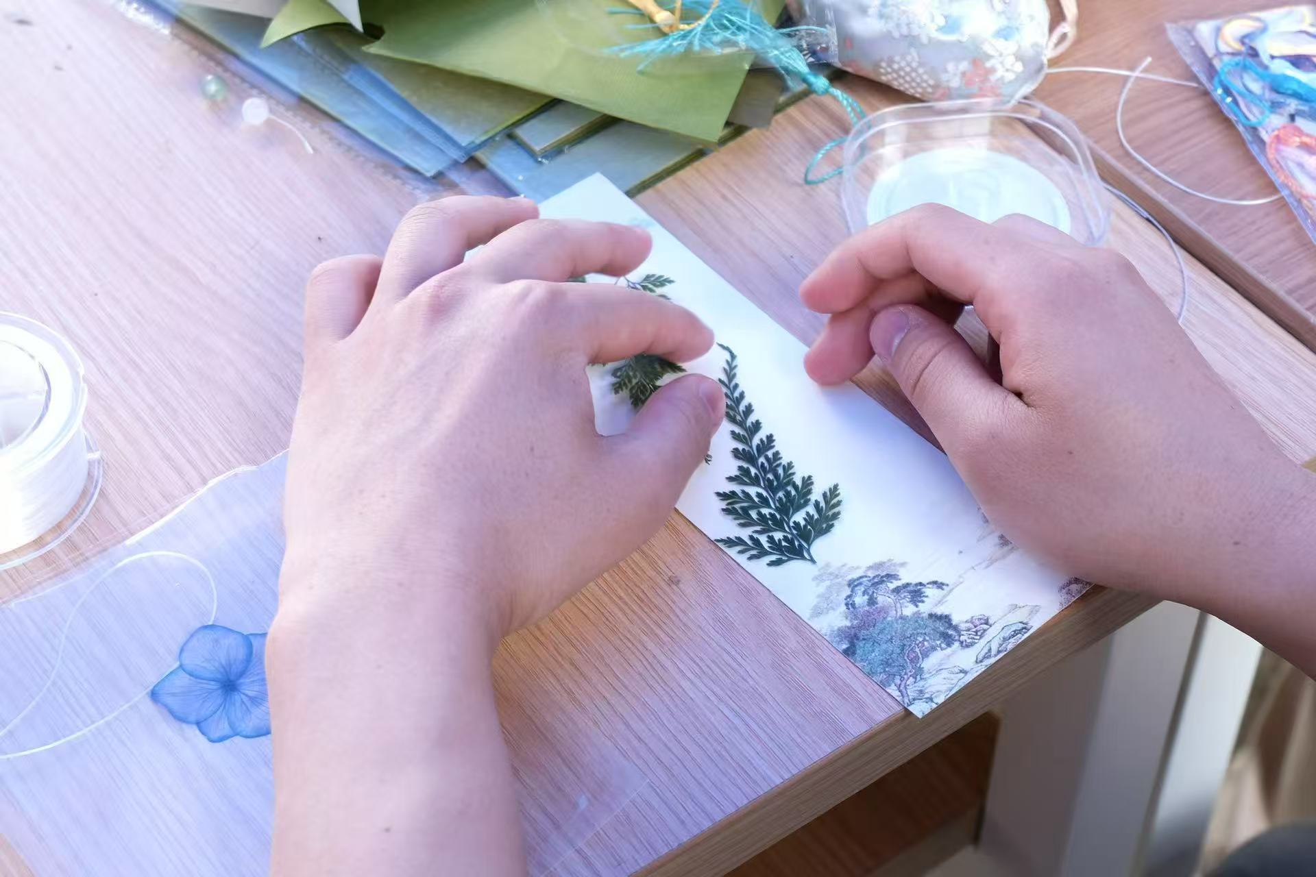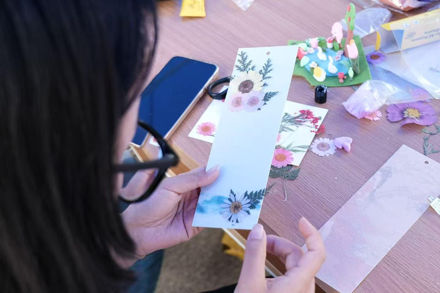 参与者围坐在铺满碎花的桌前,用镊子将干花细密排列在素笺上,错落有致的自然拼贴。当细麻绳穿过书签顶端的小孔,系上流苏坠饰,一件专属的阅读信物便翩然诞生。这些承载着春日记忆的书签,不仅为阅读时光增添芬芳,更将成为珍藏四季轮回的微型艺术标本。