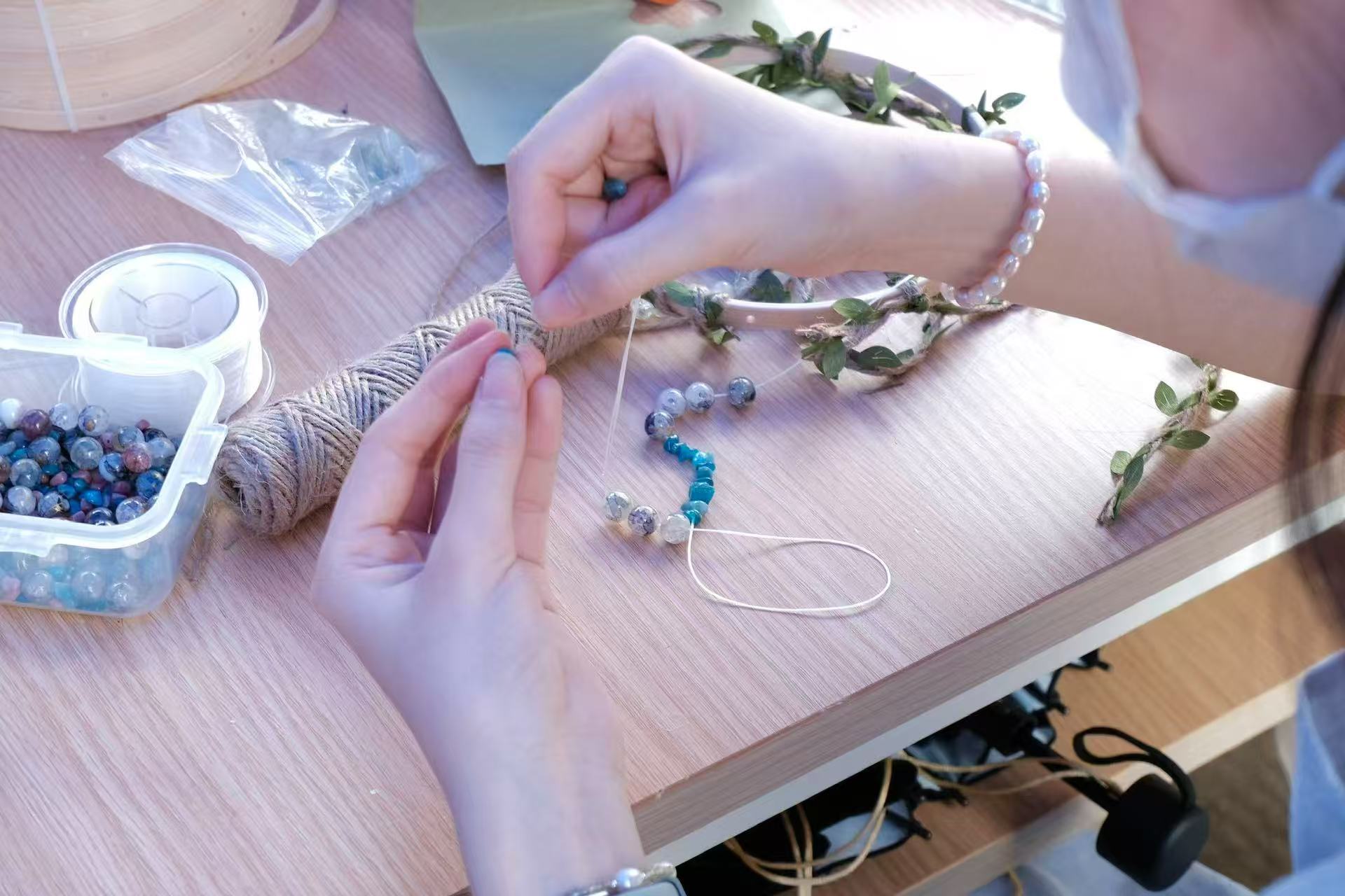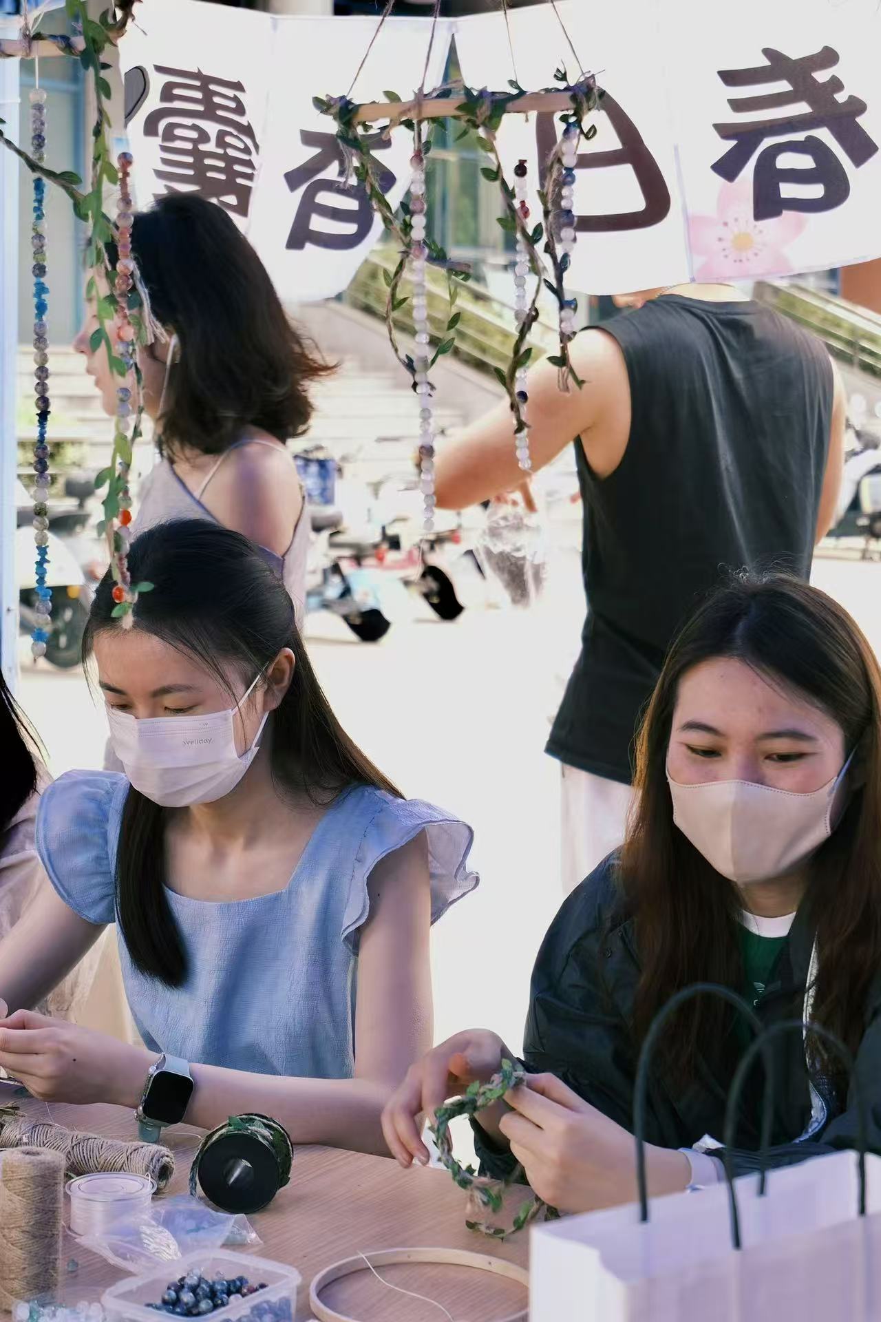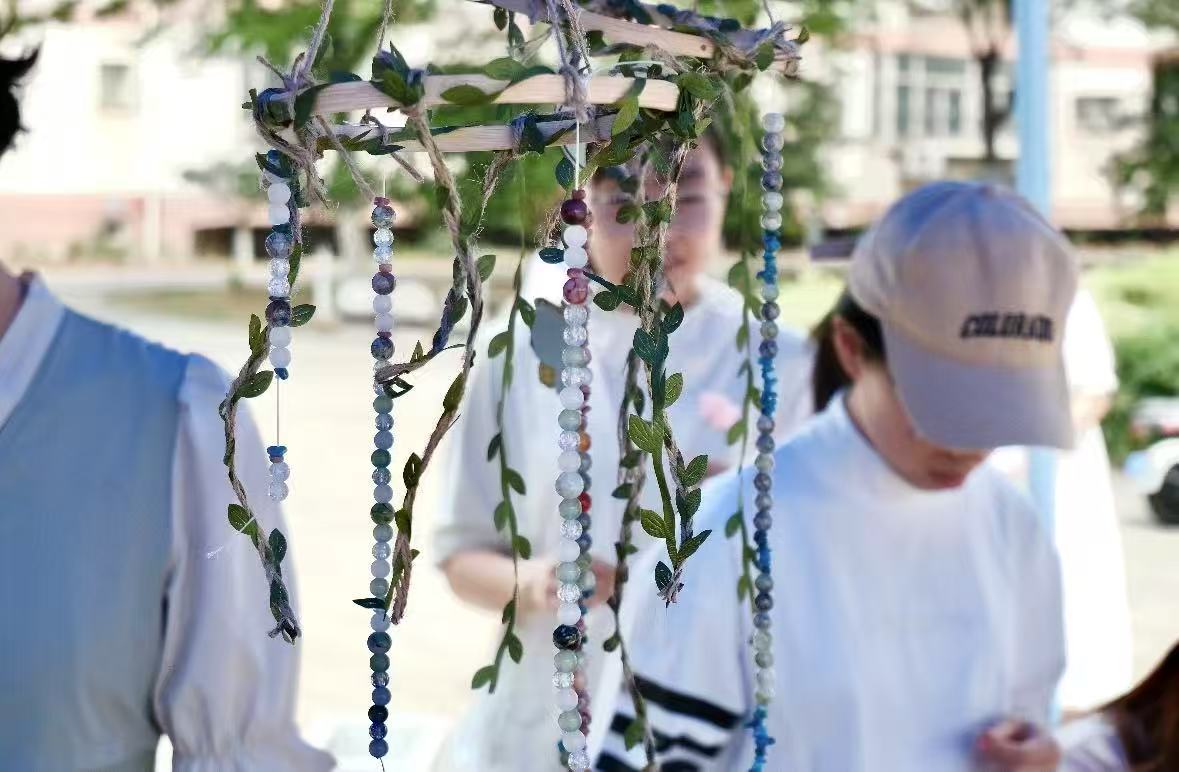 参与者搭配五彩串珠与新绿枝叶,用麻绳、弹线在风铃框架上编织出独特的春日韵律。随风摇曳的铃铛与午间细碎光影共同绘就校园如画风景,铃声叮当是参与者用春风为夏日写好的信笺。
