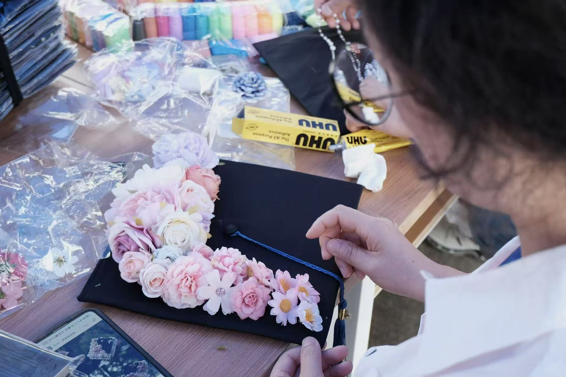 参与者用干花束、珍珠链和丝带装饰硕士帽,丝带所系住的不只是花叶,更是校园角落里那些每日亲历的晨昏故事。当正午的阳光穿过薄如蝉翼的压花,二者的相逢构筑出一整个春天离开前最后的璀璨。