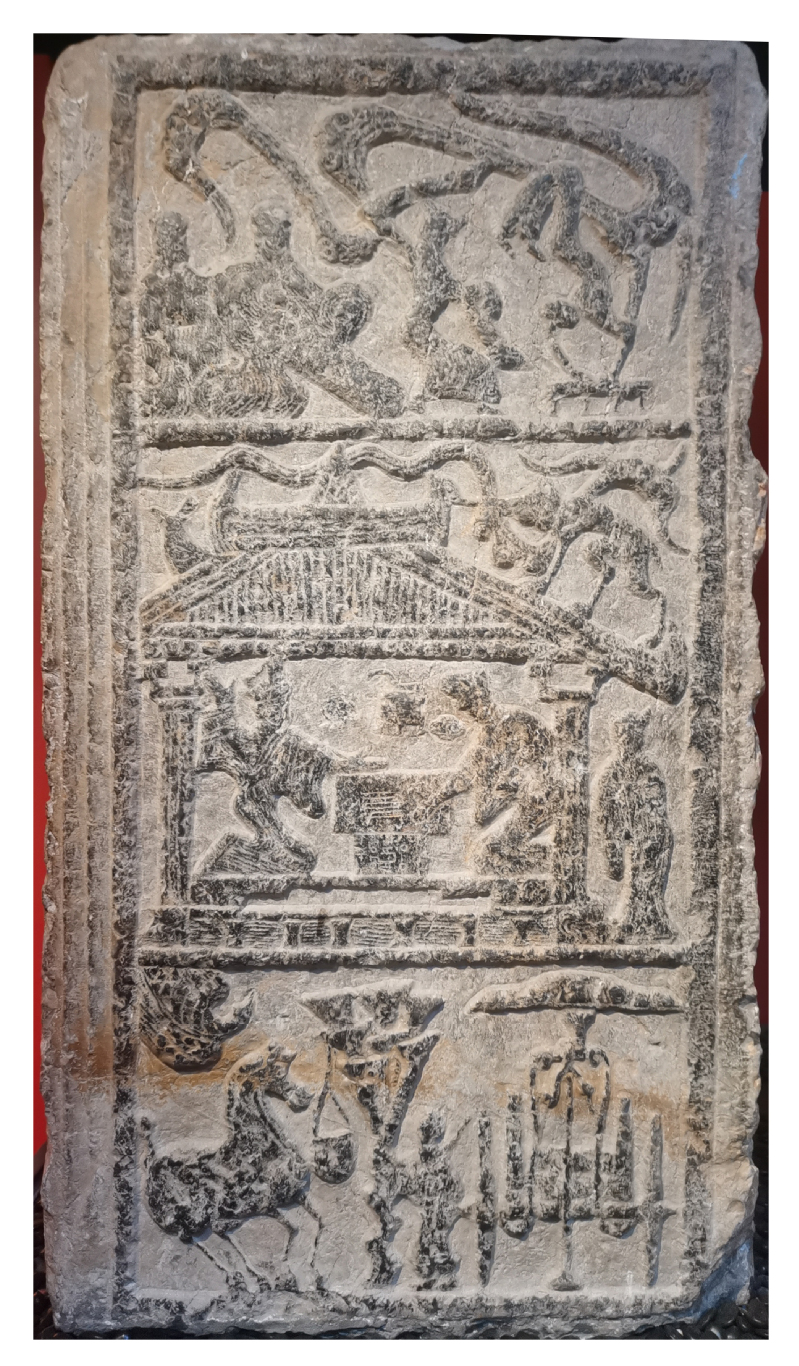 图(6)徐州《乐舞六博车马》汉画像石阙,三层浅浮雕,分别刻画乐舞表演、室内对博、饲马图和轺车(沛县古泗水出土,长110厘米、宽60厘米、厚60厘米)