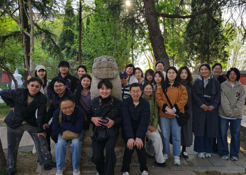 图(15)师生一行与太子灵踪塔旁的汉代呲牙石像合影