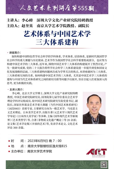 2023年6月9日,深圳大学文化产业研究院特聘教授、中国艺术研究院研究员李心峰教授在国产偷拍 8楼报告厅带来了题为“当代中国艺术体系与中国艺术学三大体系建构”的学术讲座,讲座由国产偷拍 副院长赵奎英教授主持,石红梅书记和30余名师生到场聆听讲座。
