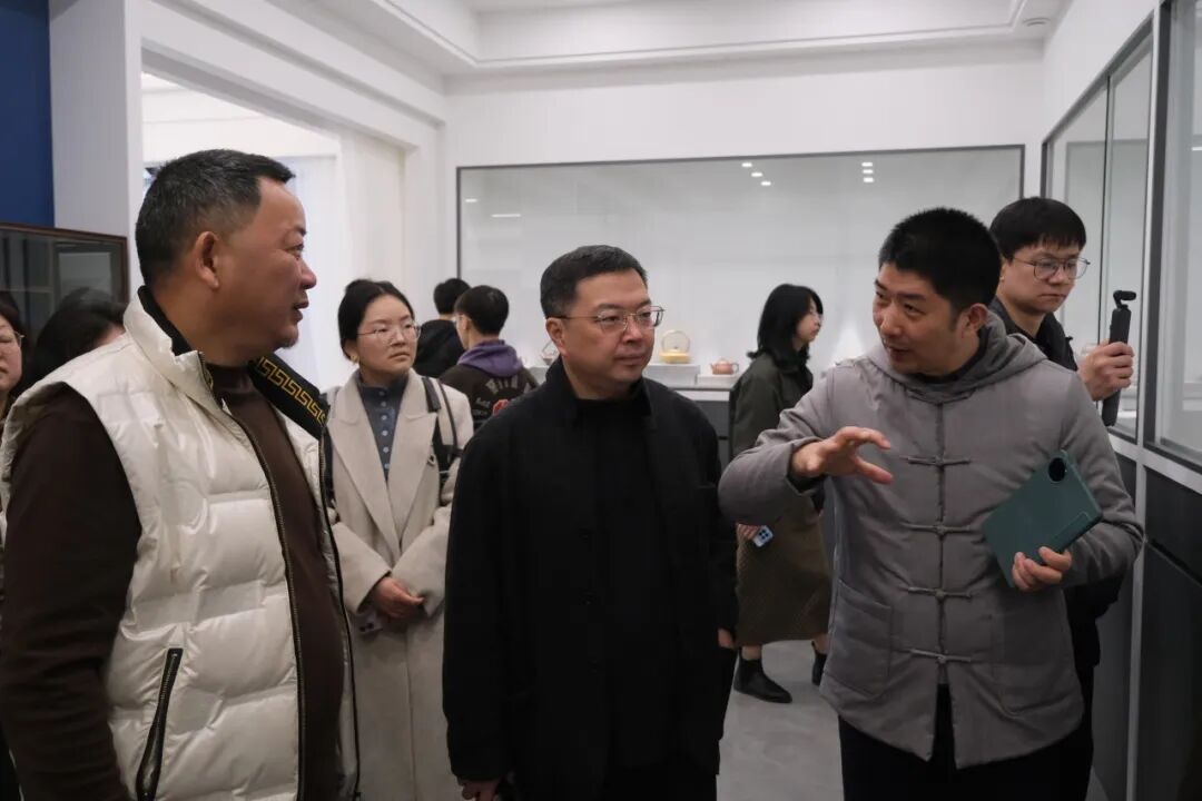 傍晚时分,两队人员在吴鸣艺术馆会合,共同拜访中国工艺美术大师吴鸣,参观吴鸣艺术馆。120余件作品横跨20世纪八90年代至今,吴鸣以肌理表达见长,突破传统光器规整端方的惯常做法,将现代雕塑观念与抽象艺术语言融入其中,东方文人气韵与个人哲学思考并存。“传统根基、现代形态、文人内涵、肌理先锋”——这一创作理念让在场师生对紫砂的跨界可能有了更深认识。