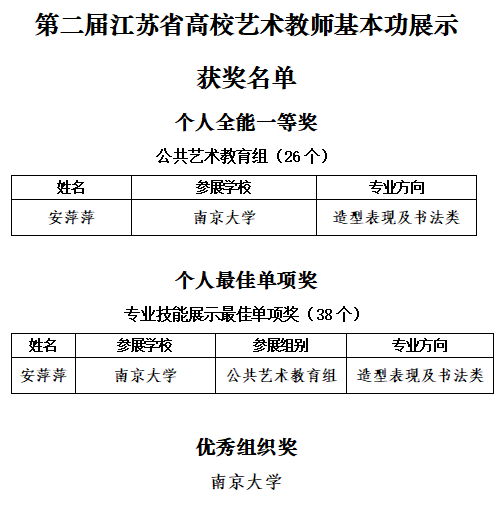 近日,江苏省教育厅公布了第二届江苏省高校艺术教师基本功展示活动的获奖名单,国产偷拍 教师安萍萍荣获公共艺术教育组个人全能一等奖、专业技能展示最佳单项奖;国产偷拍 荣获优秀组织奖。