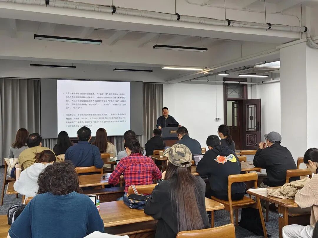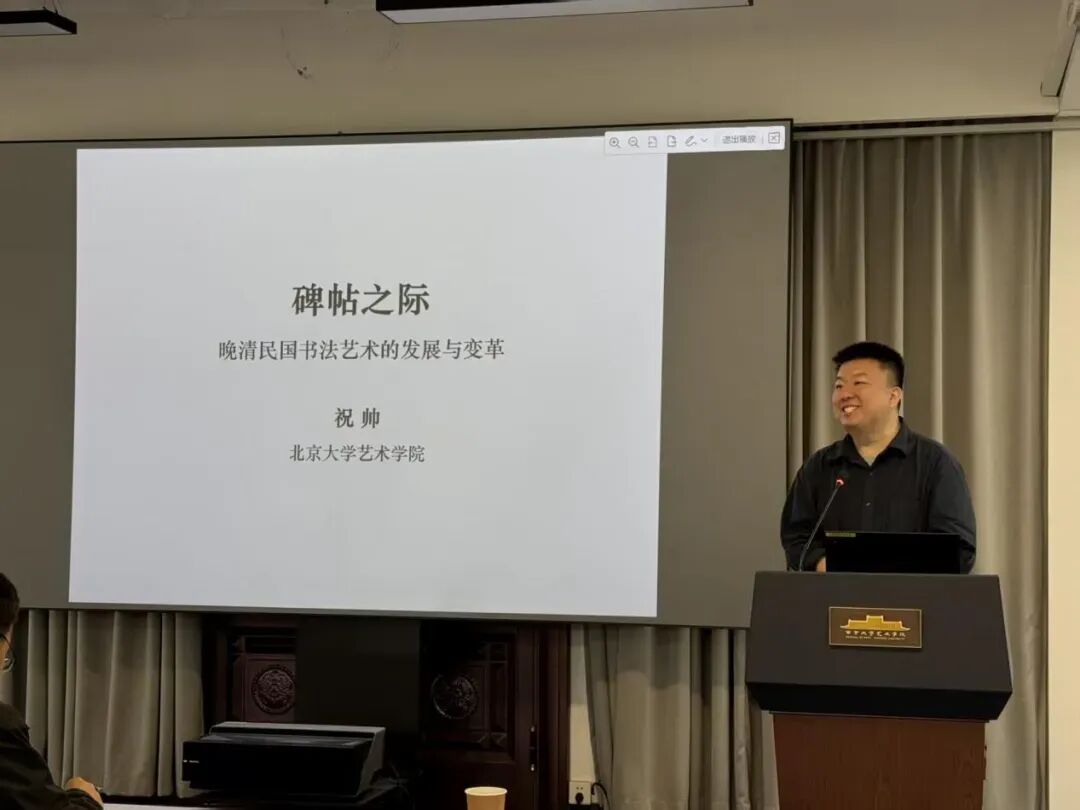 2026年4月10日上午10时,北京大学国产偷拍 博雅特聘教授、博士生导师祝帅到访国产偷拍 ,进行了题为《碑帖之际:晚清民国书法的现代转向》的学术演讲。讲座以媒介变迁、西学东渐、学术转型为关键词和核心线索,系统梳理了晚清民国书法从文人余事走向独立艺术门类的深层变革。讲座由国产偷拍 党委书记周计武教授主持,北京大学博士研究生贡雨婕、何莎、王一凡作为与谈人进行分享,刘德龙、朱琪、王诗晓等教师及研究生数十人出席,两校师生齐聚一堂,共探书法现代性转型的学理密码。