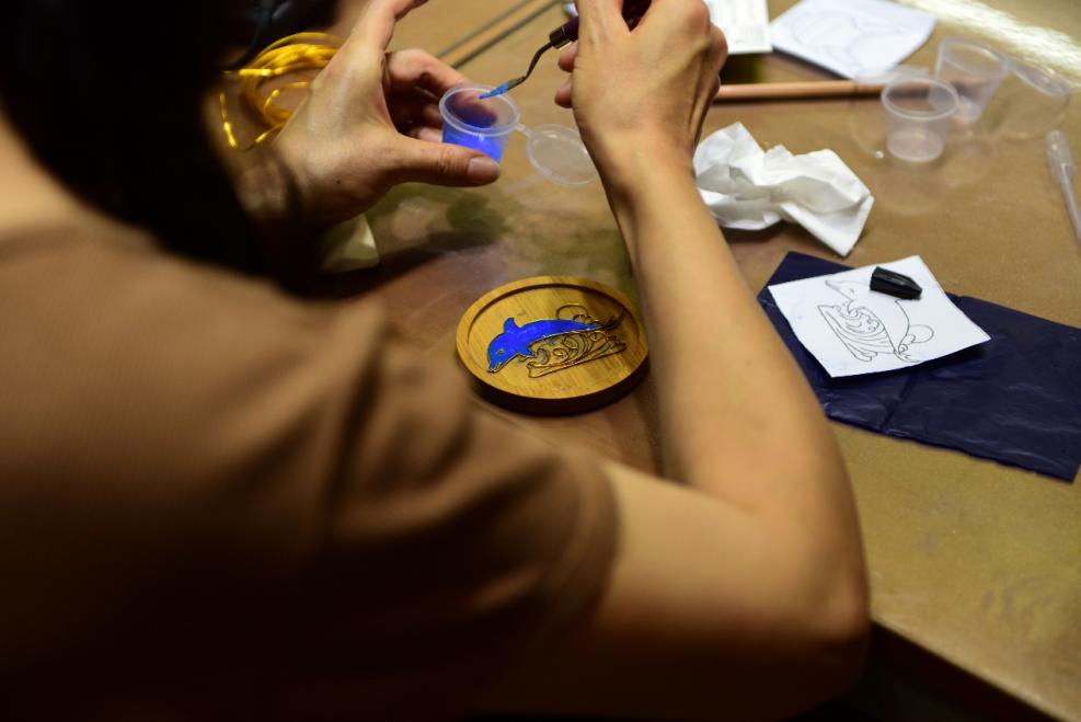 在课堂中两位主讲人详细的介绍了掐丝珐琅工艺由唐代以来在中国的发展,以及景泰蓝命名的由来,学员们在历史发展中感受中国传统手工艺的文化底蕴与历史积淀。本次活动依托“希腊时代彩陶及普利亚艺术文化特展”,设计出了诸如“海豚骑士”“猫头鹰”等一系列图样,课堂中利用掐丝工艺,将其纹样的美感展现出来,让学员在体验掐丝工艺的过程中,也能回想到希腊彩陶文化的灿烂多彩。