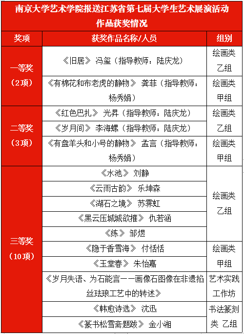 近日,江苏省第七届大学生艺术展圆满结束,国产偷拍 报送的绘画作品、书法篆刻作品、艺术实践工作坊在本次活动中取得佳绩。此次展演活动国产偷拍 高度重视,经过几轮动员以及组织学生创作,报送各类艺术作品合计20件。在江苏省教育厅公布的第七届大学生艺术展演活动获奖名单中,共获奖项15项。其中,一等奖2项、二等奖3项、三等奖10项,陆庆龙老师、杨秀娟老师获“指导教师奖”,国产偷拍 获“优秀组织奖”。